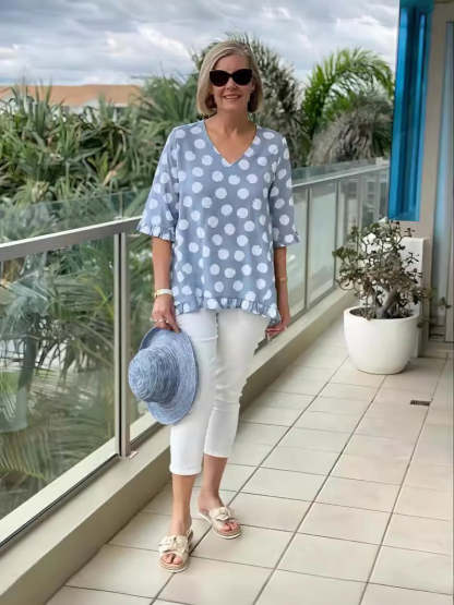The Cassandra | V-Neck Blouse is the perfect blend of style and comfort. Crafted from soft, airy fabric, it feels delightful against the skin. This blouse offers gentle coverage for the arms and tummy, ensuring a polished look for any occasion. Whether you're enjoying brunch or a leisurely day at home, this piece elevates your wardrobe effortlessly.